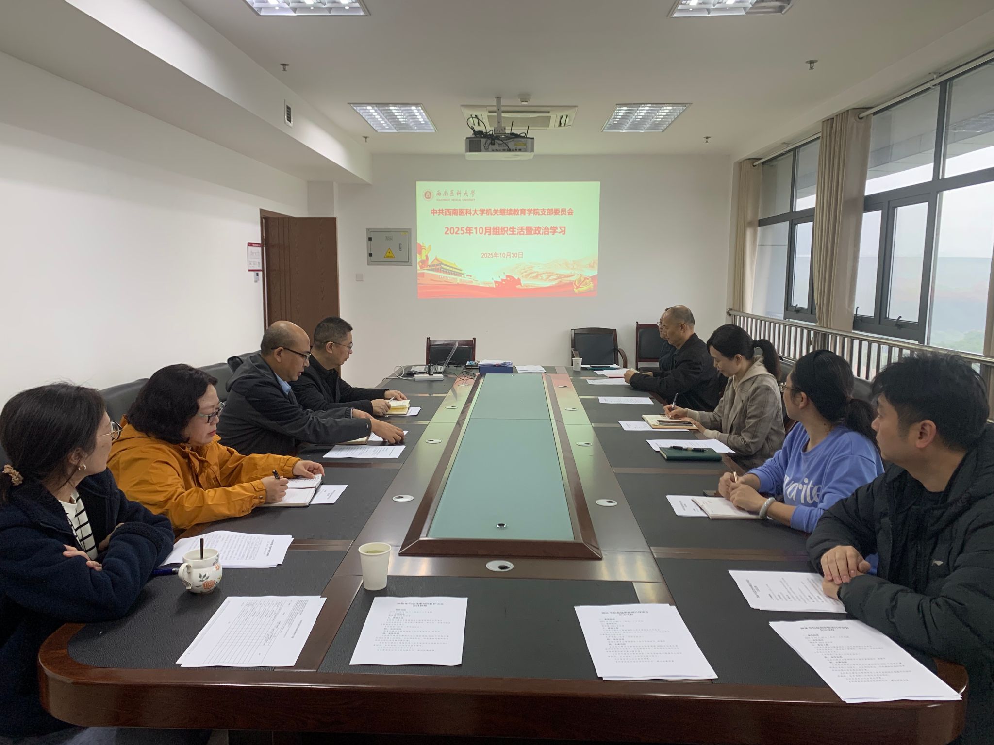 2025年10月30日,机关党委公司党支部在德诚楼1012会议室召开2025年10月组织生活暨政治学习。本次会议以“学习贯彻党的二十届四中全会精神,推动继续教育高质量发展”为主题。由支部书记杜杰主持,全院职工参加了此次会议。