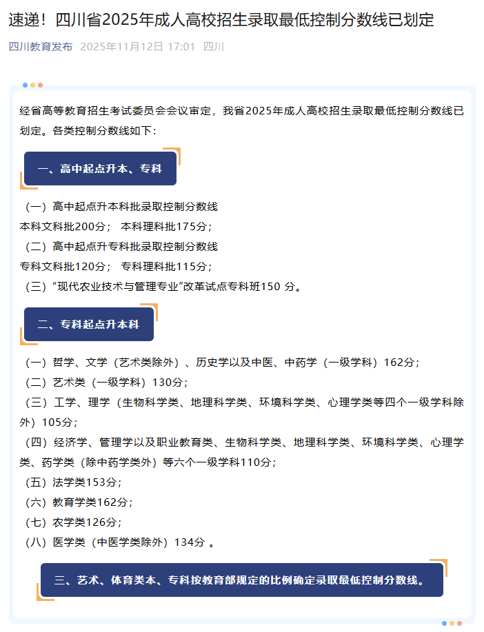 11月12日,四川省教育考试院发布通知,经省高等教育招生考试委员会会议审定,四川省2025年成人高校招生录取最低控制分数线已划定。见下图。